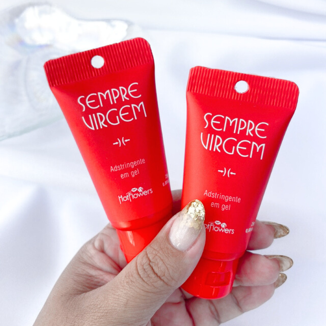 O Sempre Virgem é um gel adstringente desenvolvido para proporcionar uma sensação imediata de estreitamento na região íntima feminina. Sua fórmula combina ingredientes naturais como barbatimão e pedra hume (alúmen de potássio). O toque de menta adiciona uma leve sensação refrescante, despertando o desejo e tornando o momento ainda mais envolvente.